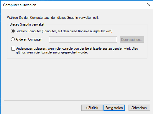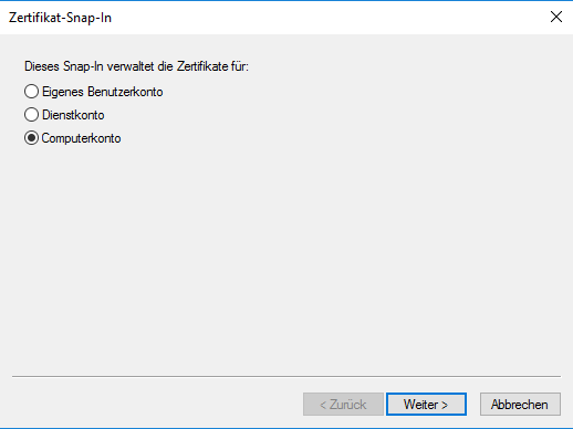 Wählen Sie nun "Computerkonto" bei "Dieses Snap-ln verwaltet die Zertifikate für". Wählen Sie "Lokalen Computer" im nächsten Fenster und klicken Sie auf "Fertigstellen"