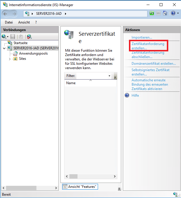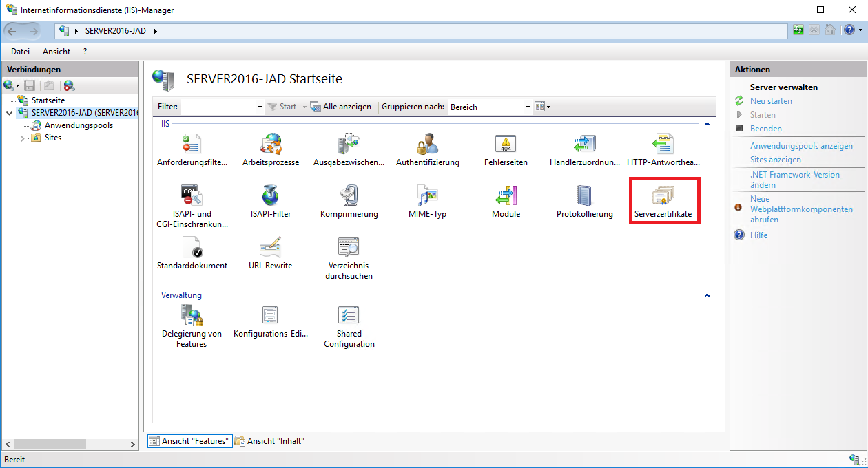 Im IIS Manager wählen Sie den betreffenden Servernamen aus. Starten Sie in der Ansicht "Features" unter "IIS" das Menü "Serverzertifikate".