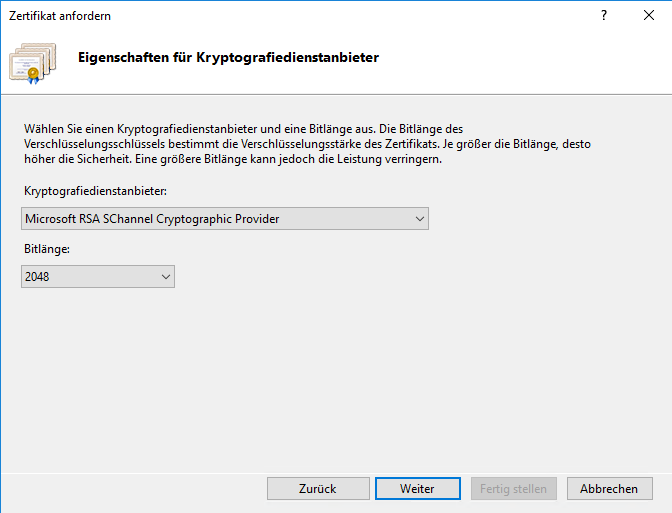 Dahinter verbirgt sich der Kryptografie Mechanismus - wählen Sie hier, sofern noch nicht vorausgewählt, RSA. Die Bitlänge des Schlüsselpaares muss mindestens 2048 Bit betragen. Voreingestellt ist ein Wert von 1024 Bit, der inzwischen aber von allen großen Zertifizierungsstellen abgelehnt wird.