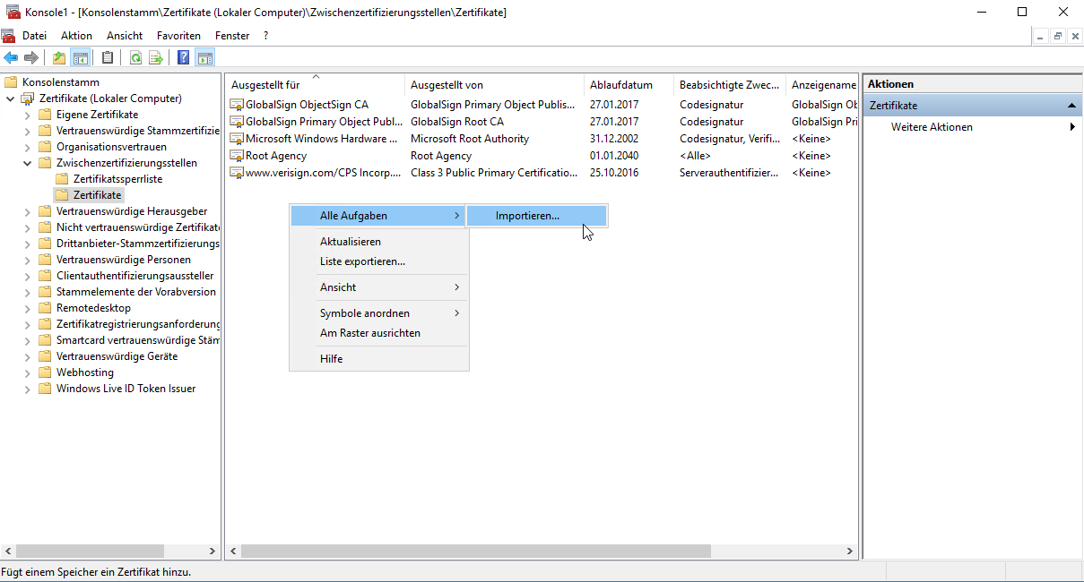 Öffnen Sie hier den Zweig "Zwischenzertifizierungsstellen" → "Zertifikate", danach mit einem Rechtsklick das Kontextmenü und hier den Punkt "alle Aufgaben" → "lmportieren".