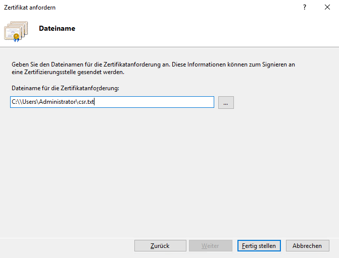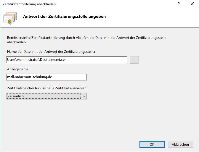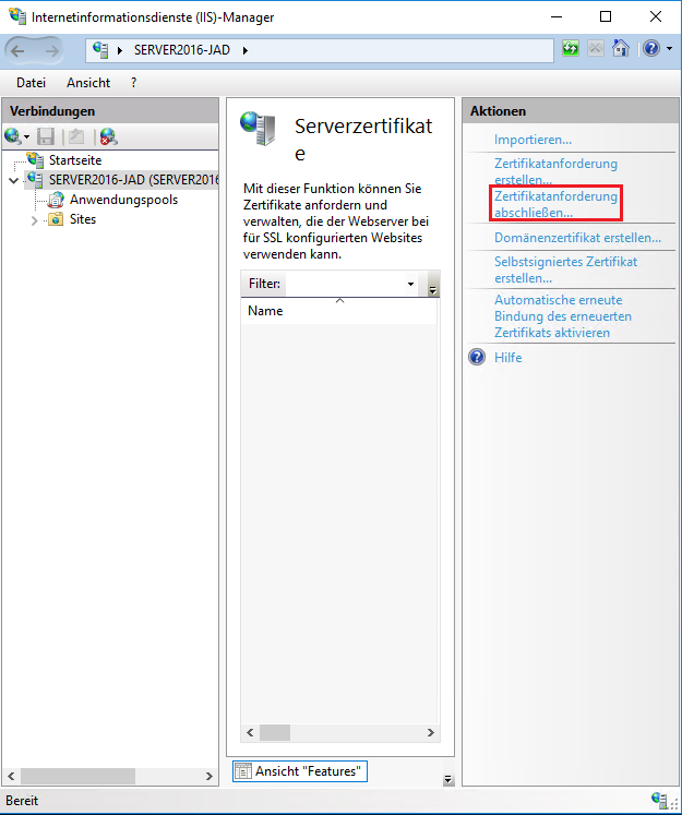 Spielen Sie nun über den Punkt "Zertifikatsanforderung abschließen" das fertige Zertifikat ein. Folgen Sie dabei den Anweisungen im Dialog.