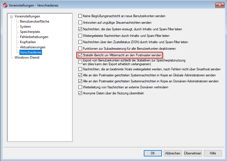 Per Voreinstellung wird jeden Tag um Mitternacht ein Statistik-Bericht an den Postmaster gesandt.