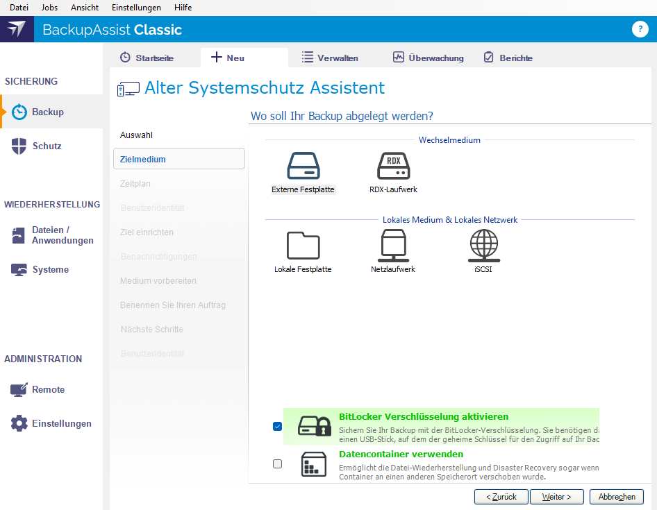 In den folgenden Schritten erklären wir Ihnen, wie Sie ein vollständiges System-Backup mit der Wbadmin Engine (integrierte Windows System-Sicherung) mit BitLocker-Verschlüsselung in BackupAssist Classic einrichten.