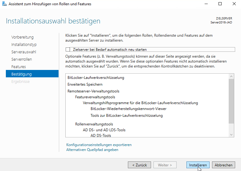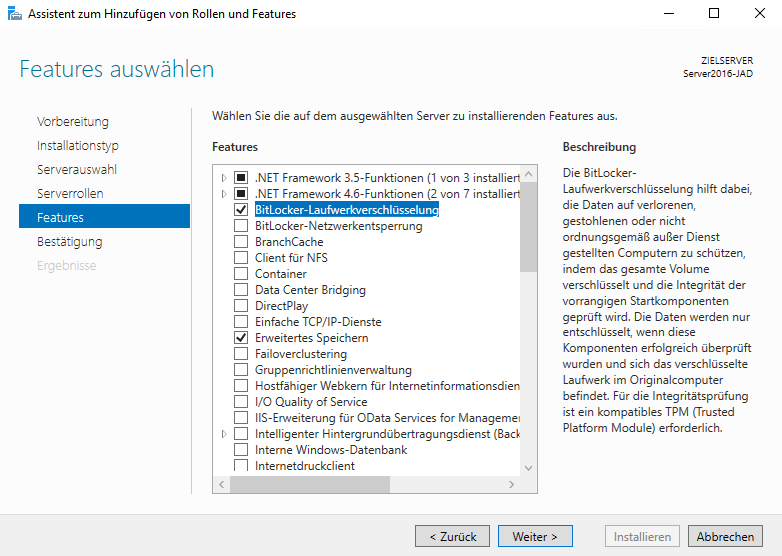 Um die BitLocker-Verschlüsselung zu nutzen, müssen Sie als erstes das Server-Feature installieren.