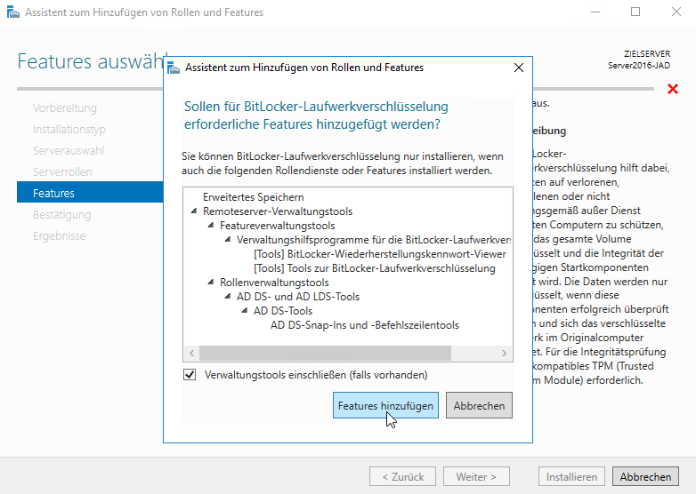 Unter Features wählen Sie anschließend die BitLocker-Laufwerkverschlüsselung aus. Das aufkommende Fenster bestätigen Sie mit Feature hinzufügen.