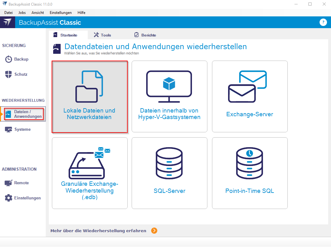 Öffnen Sie nun die BackupAssist Konsole. In dem linken Menüband finden Sie den Reiter Wiederherstellung→ Dateien / Anwendungen.