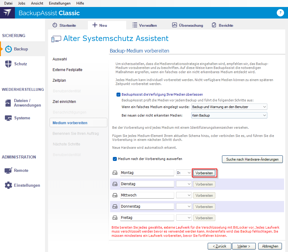 Im nächsten Schritt unter Medium vorbereiten klicken Sie, bei dem ausgewählten Medium, auf den Button "Vorbereiten". Anschließend bestätigen Sie mit Weiter.