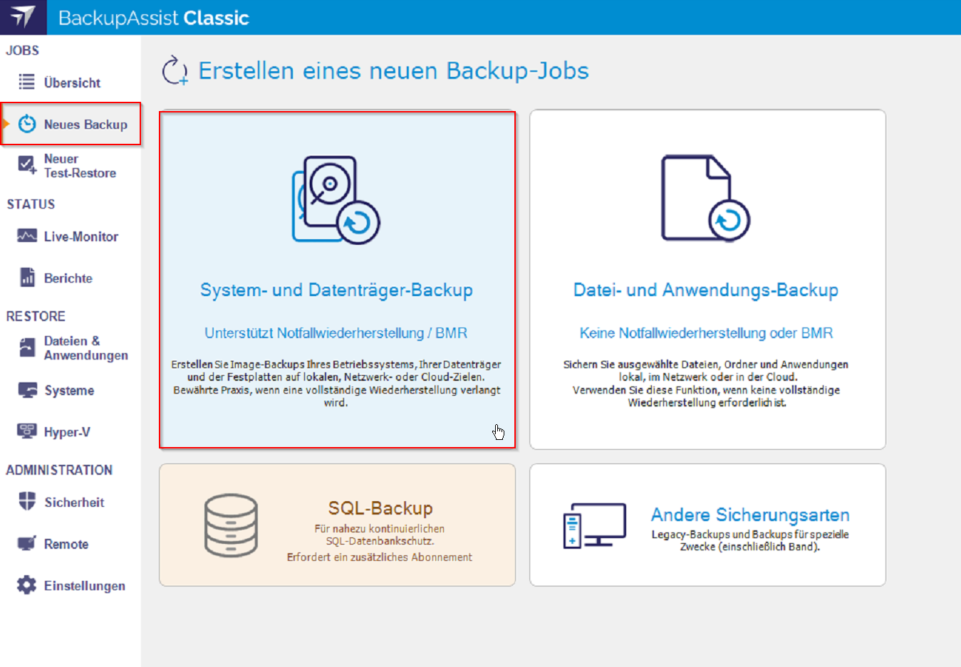 Nun können Sie in BackupAssist Classic einen Job erstellen. Hierzu öffnen Sie die BackupAssist Konsole. Klicken Sie unter dem Reiter Neues Backup auf System- und Datenträger-Backup.
