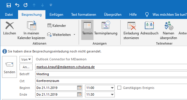 Erstellen Sie in Outlook einen neuen Termin mit Besprechungsanfrage und tragen Sie den oder die Empfänger unter An... ein