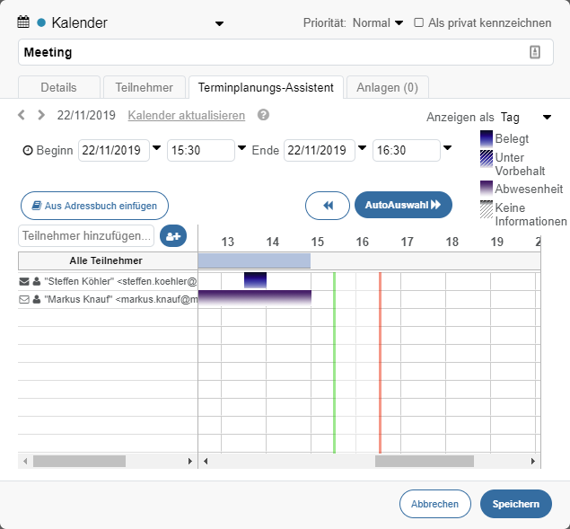 Der MDaemon EMail Server hat einen eigenen Frei/Gebucht-Server integriert, mit dessen Hilfe der Organisator einer Besprechung prüfen kann, wann die gewünschten Teilnehmer verfügbar sind. Diese Funktion ist über eine Verknüpfung zur Zeitplanung in der Maske für die Besprechungsplanung in MDaemon Webmail zugänglich. Die Funktion zeigt die Liste der Besprechungsteilnehmer und eine farbig gekennzeichnete Übersicht über die Kalender der Teilnehmer. Für jeden Teilnehmer wird in einer eigenen Zeile durch Farbkennzeichnung dargestellt, zu welchen Zeiten er verfügbar ist. Dabei wird nach belegt, unter Vorbehalt, Abwesend und Keine Information.