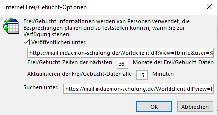 5. In den Felder Veröffentlichen unter: und unten Suchen unter: geben Sie jeweils den folgenden Link ein: http://Webmail-IP:Port>/Worldclient.dll?view=fbinfo&user=%NAME%@%SERVER%