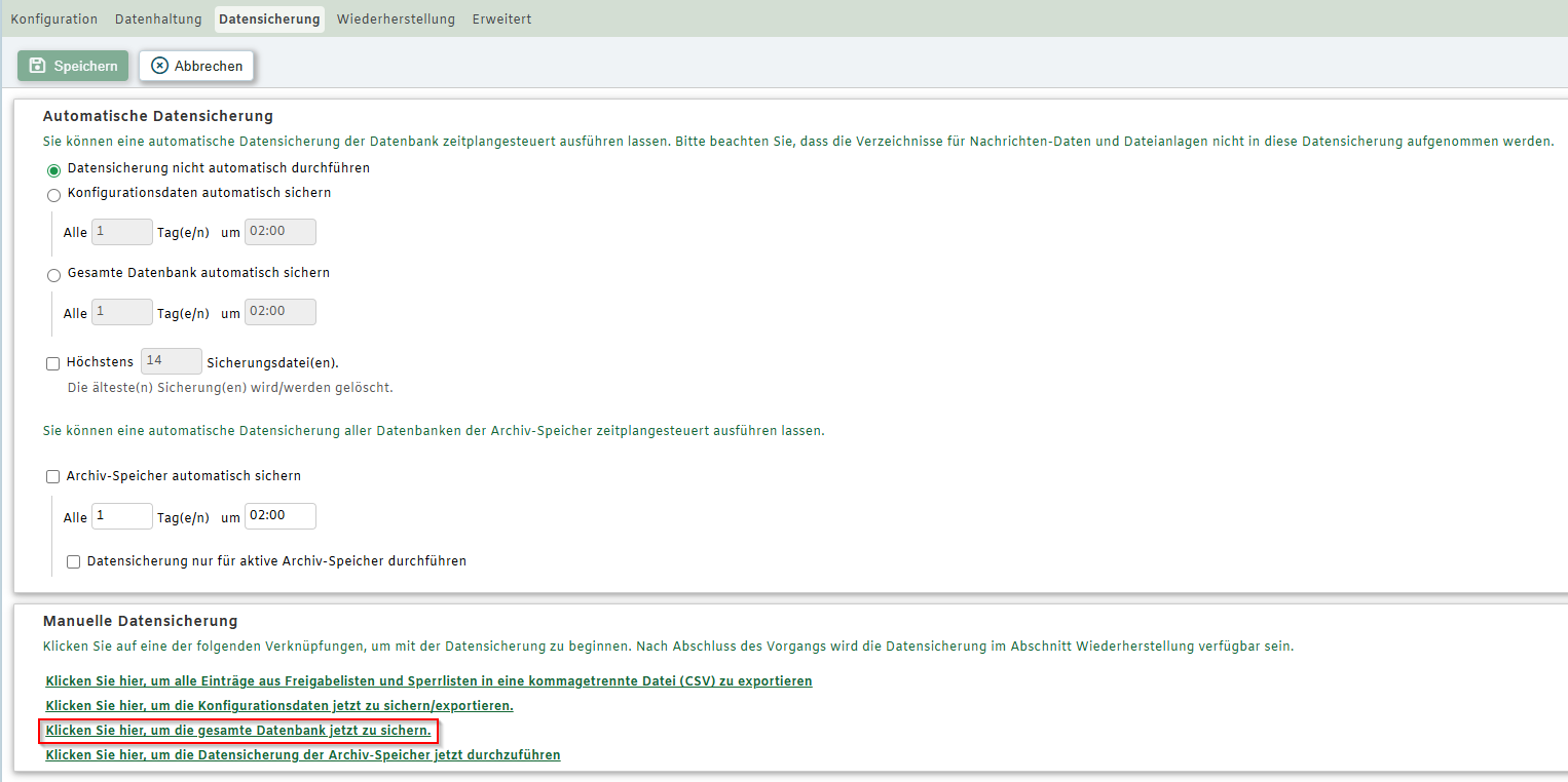 Jetzt wählen Sie die Option "Klicken Sie hier, um die gesamte Datenbank jetzt zu sichern":