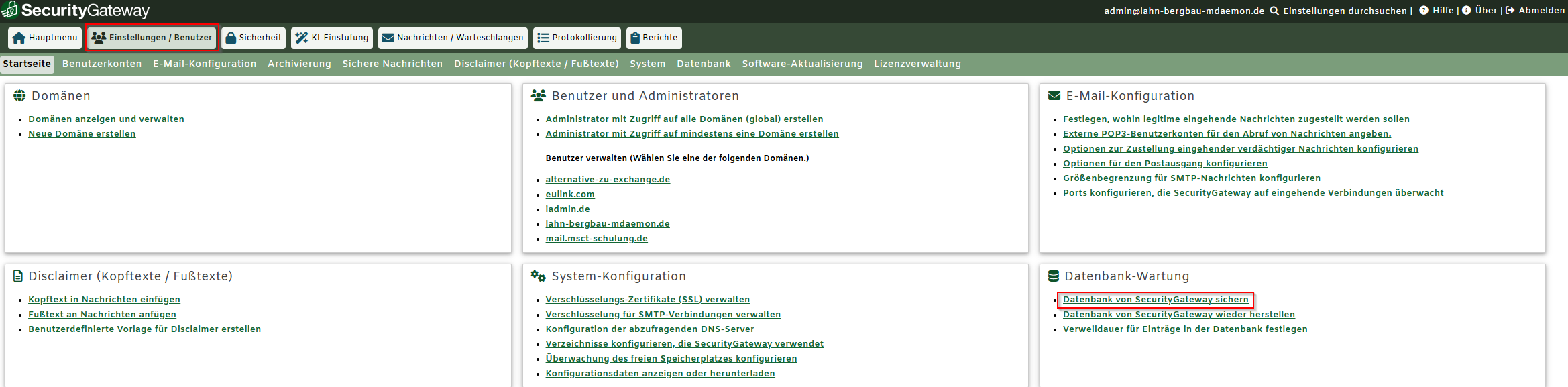 Dafür melden Sie sich an der Weboberfläche der noch bestehenden SecurityGateway Installation an und wählen die Kategorie Einstellungen / Benutzer → Datenbank-Wartung → Datenbank von SecurityGateway sichern.