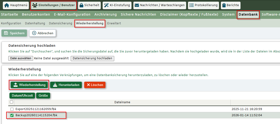 Dies können Sie unter Einstellungen / Benutzer → Datenbank → Wiederherstellung tun.
