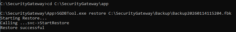 - Führen Sie folgenden Befehl mit Ihrem [Installationspfad] und Ihrem [Backupnamen] aus: sgdbtool.exe restore [Installationspfad]\SecurityGateway\Backup\[Backupname].fbk