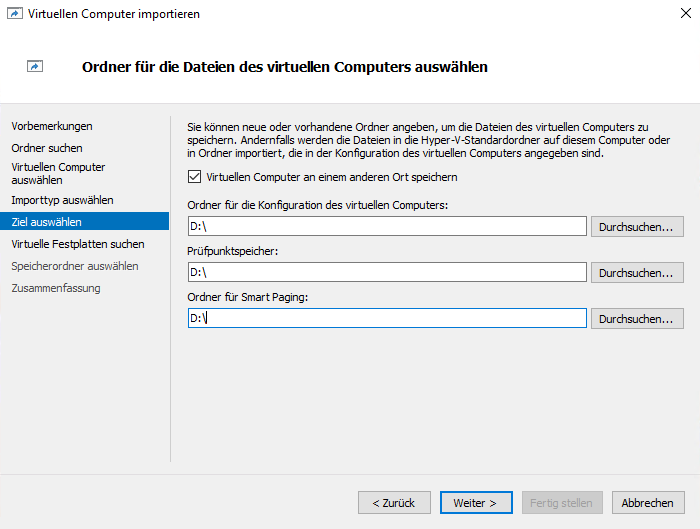 Beispielsweise wollen Sie die VMs auf D:/ importieren, also müssen diese Pfade auch auf D:/ eingestellt sein: