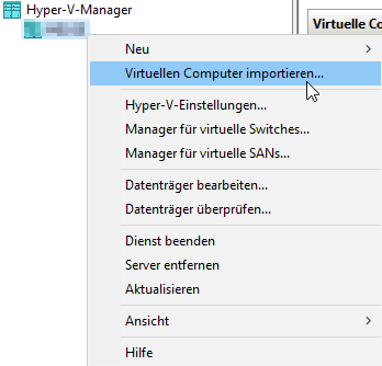 - Klicken Sie mit einem Rechtsklick auf Ihren Hostnamen und wählen "Import einer virtuellen Maschine".