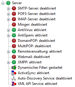 Nun sollten die SMTP-, POP3-, IMAP- und Webmail-Server in der Serveranzeige als rot und inaktiv angezeigt werden.