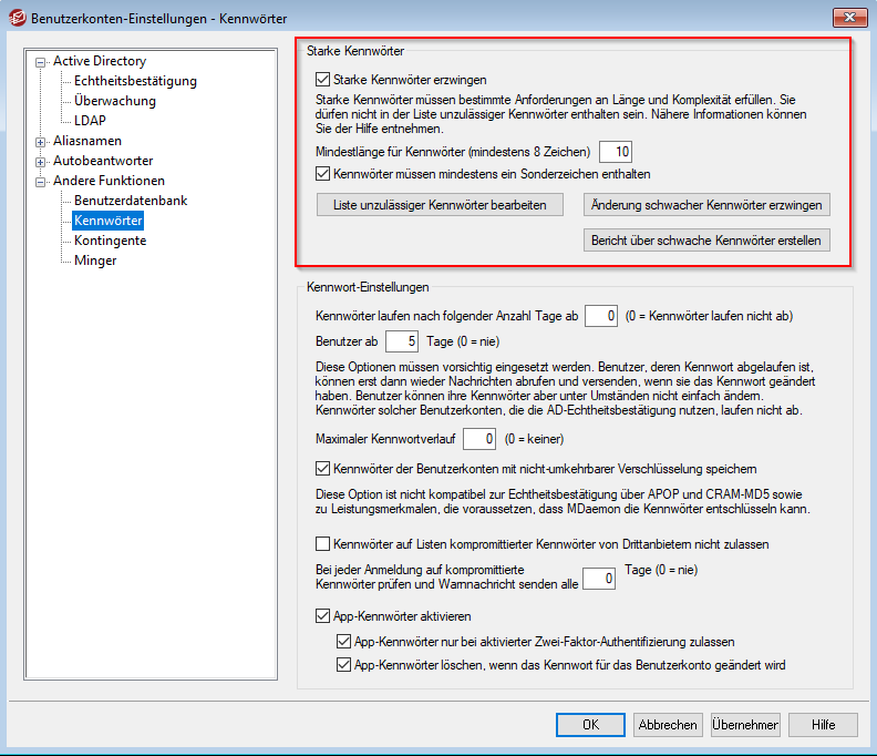 Öffnen Sie hierzu bitte in MDaemon das Menü Benutzerkonten → Benutzerkonten-Einstellungen → Andere Funktionen → Kennwörter.