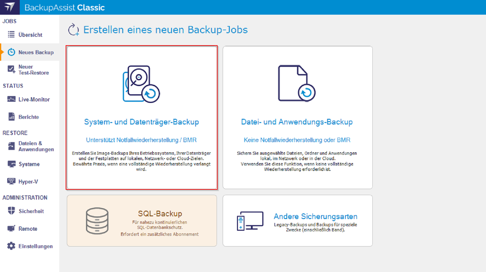 2. Klicken Sie auf System- und Datenträger-Backup:
