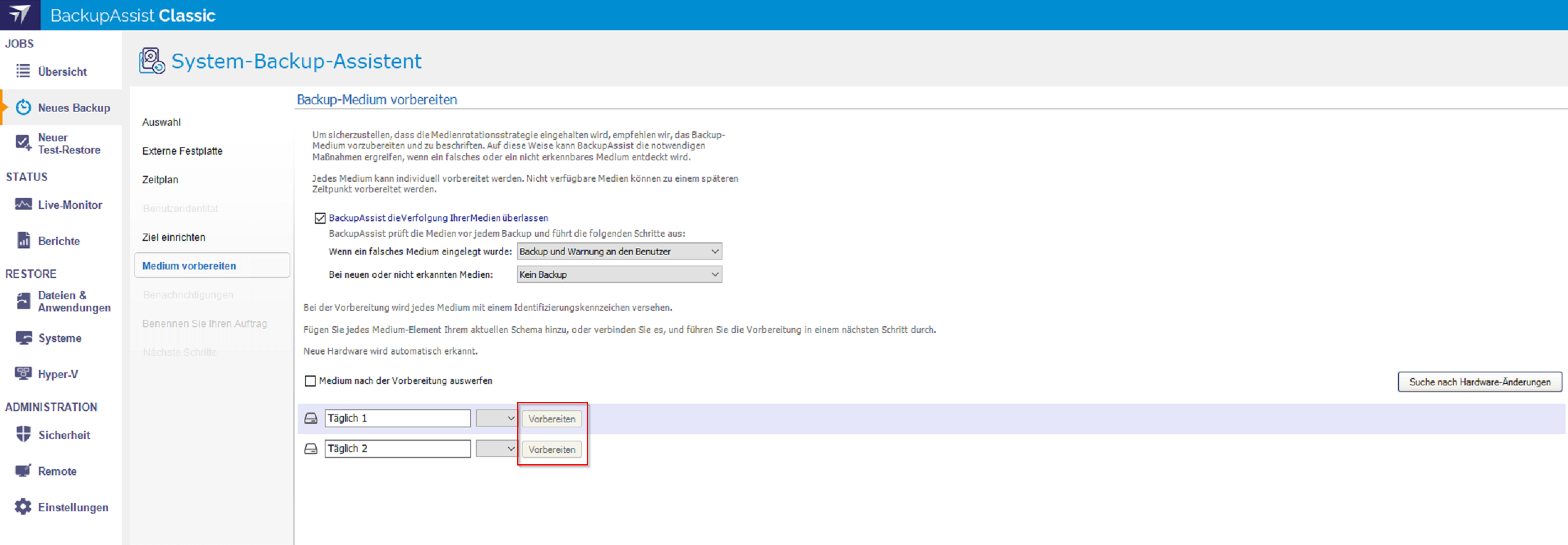7. Unter Medium vorbereiten klicken Sie bitte bei den jeweiligen Medium auf Vorbereiten.