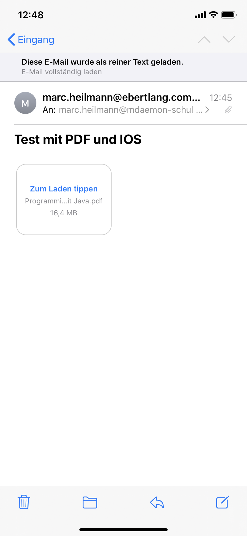 Die E-Mail muss dann manuell nachgeladen werden, um an den Inhalt und