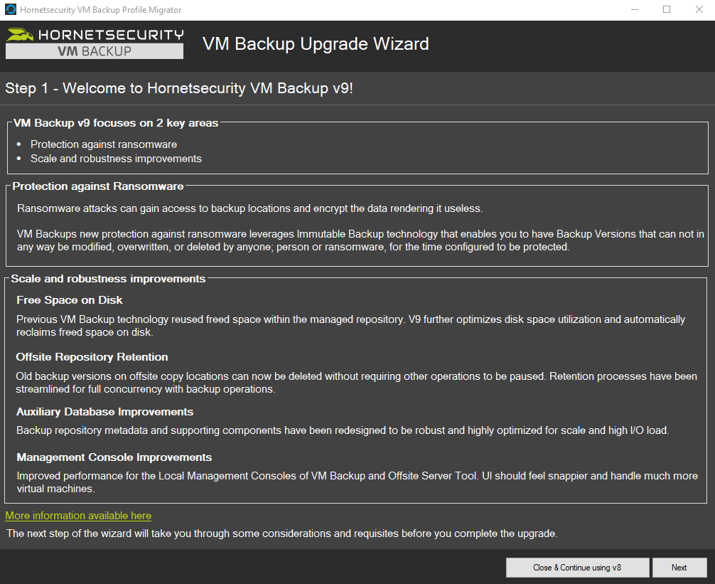 Bei dem unten beschriebenen Upgrade-Prozess von Version 8 auf Version 9 bleiben alle Ihre Einstellungen und früheren Backups erhalten (Sie können diese Backups wiederherstellen, aber es ist ein neues Backup-Set erforderlich für Version 9). Altaro VM-Backup v9 bleibt nach der Migration mit dem Control Panel verbunden.