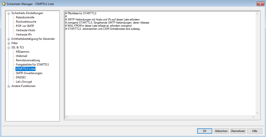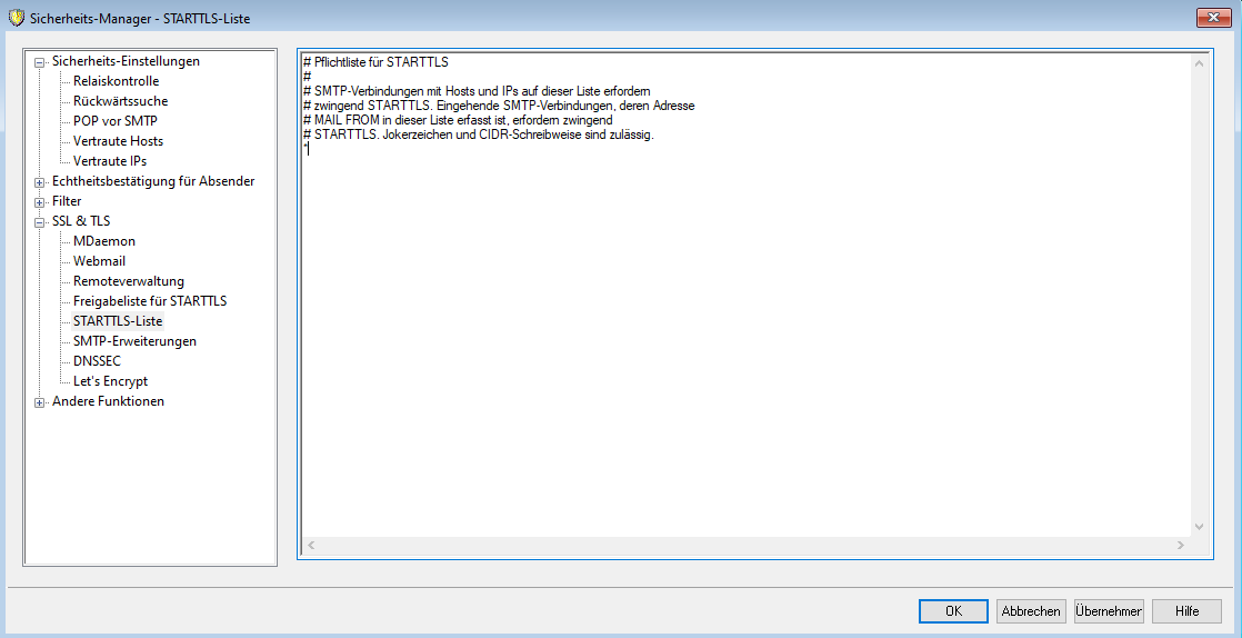 - Öffnen Sie in der MDaemon-GUI das folgende Menü über Sicherheit → Sicherheits-Manager → SSL & TLS → STARTTLS-Liste: