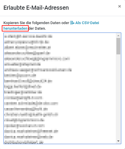 Für einen einfachen Export gehen Sie auf die Schaltfläche "Exportieren" und alle einzelnen E-Mail-Adressen werden angezeigt. Diese können dann manuell kopiert oder als .csv-Datei heruntergeladen werden.
