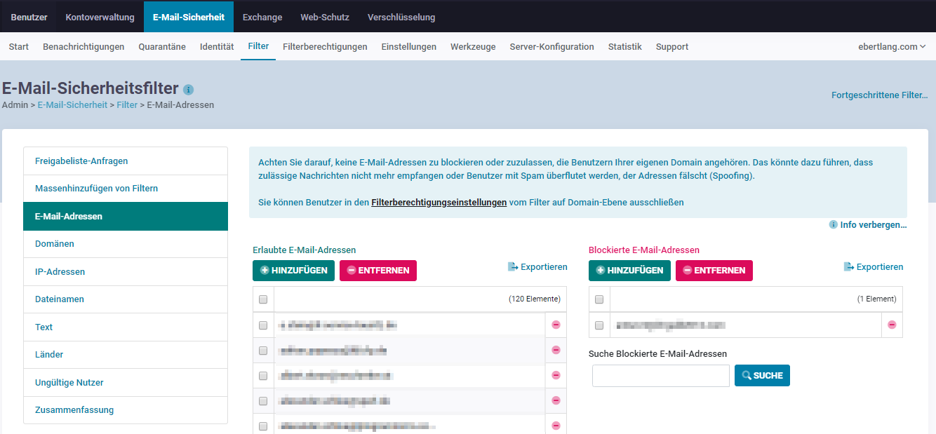Daraufhin navigieren Sie in der Oberfläche zu E-Mail-Sicherheit → Filter → E-Mail-Adressen. Hier finden Sie nun die Listen für die zugelassenen und blockierten E-Mail-Adressen.