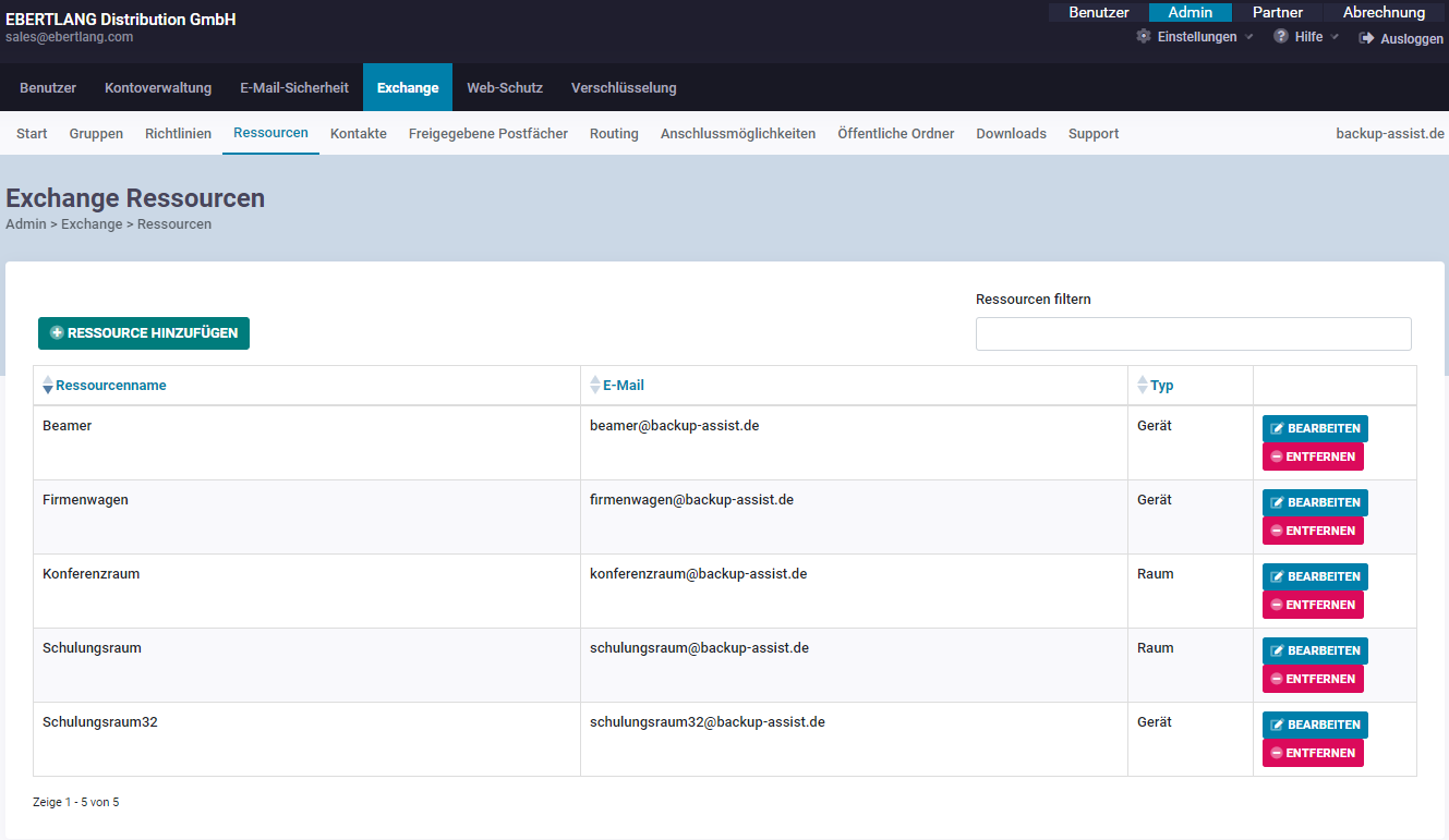 Im Kundenportal in dem Bereich "Admin" im Reiter "Exchange" können Sie unter "Ressourcen" diese Raum- und Gerätepostfächer erstellen.