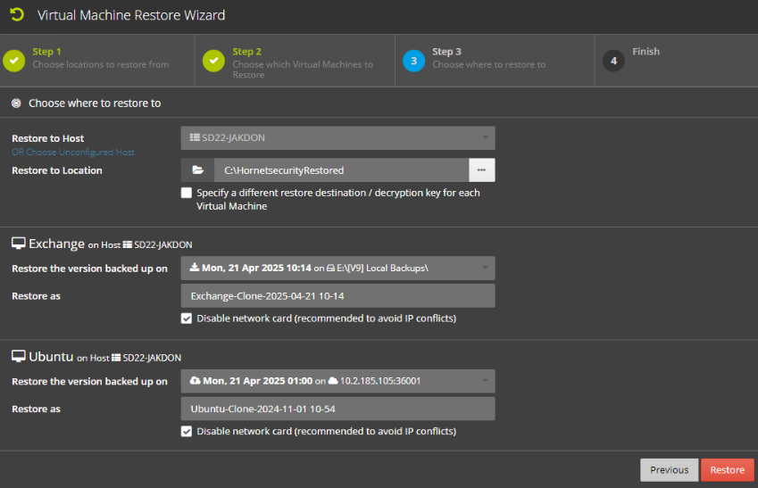 Nun können Sie für jede VM die Version, den Namen sowie auswählen, ob die Netzwerkkarte wiederhergestellt und aktiviert werden soll.