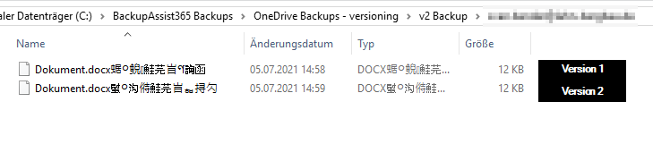 Beim Versioning handelt es sich um ein Feature, das Sie bei Dateibackups (SharePoint, OneDrive, GoogleDrive, Dropbox etc.) aktivieren können, um ältere oder gelöschte Datenversionen einer vorherigen Sicherung zu behalten. Ein Beispiel: Sie sichern aus Ihrem OneDrive eine DOCX-Datei und verändern sie danach. Beim nächsten Backup wird dann die veränderte Version gesichert und Sie haben außerdem noch Zugriff auf die Datei-Version aus der ersten Sicherung. Dies ist in BackupAssist 365 möglich, indem während der Sicherung ein einzigartiger Unicode an den Dateinamen angehängt wird.