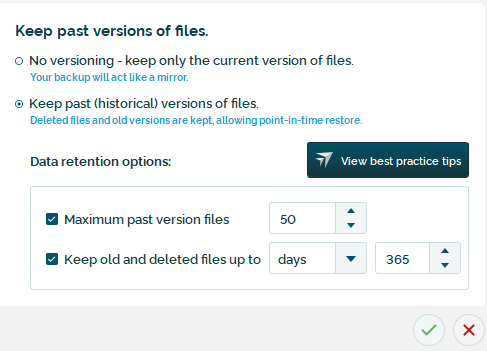 Bei der Konfiguration des Versionings müssen Sie eine Retention Policy erstellen. Wählen Sie hier bitte aus, wie viele Datei-Versionen einer Datei maximal in einem Sicherungsziel gesichert werden dürfen. Außerdem legen Sie hier fest, wie lange eine Datei-Version maximal aufgehoben werden darf.