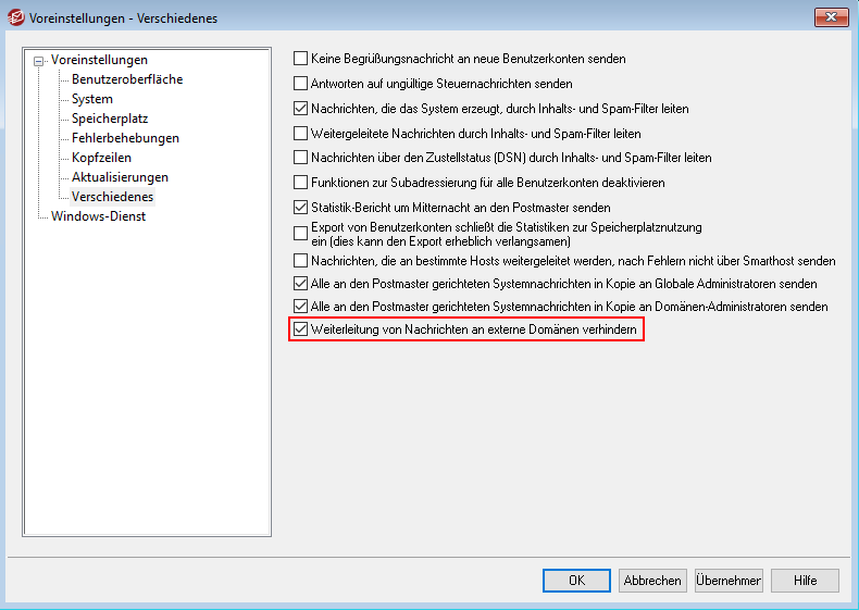 Diese lautet "Weiterleitungen von Nachrichten an externe Domänen verhindern" und ist im MDaemon unter "Einstellungen → Voreinstellungen → Verschiedenes" zu finden.