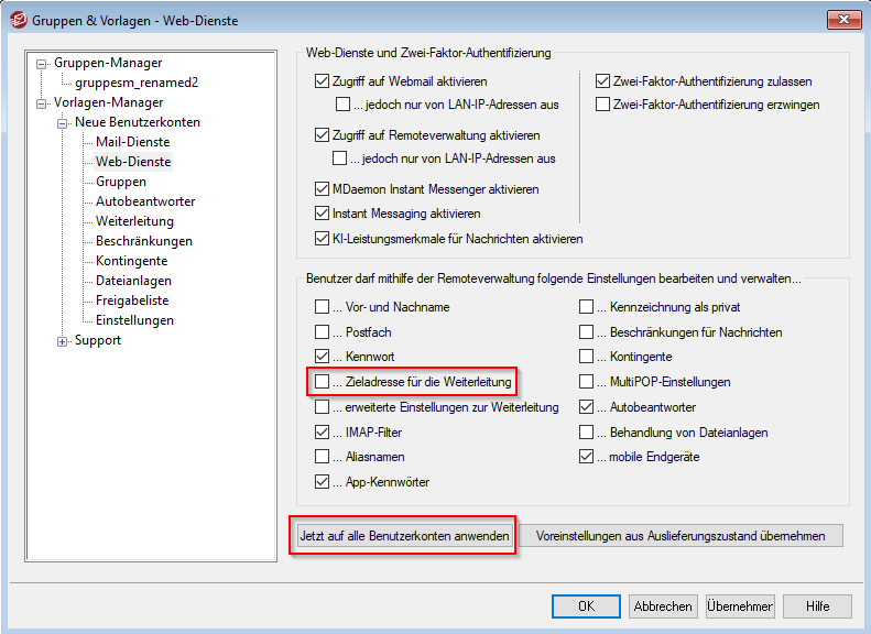 Generelle Unterbindung: Wenn Sie übergreifend externe Weiterleitungen verbieten möchten, öffnen Sie im MDaemon den Gruppen-Manager unter Benutzerkonten → Gruppen & Vorlagen → Neue Benutzerkonten → Web-Dienste. Auch hier deaktivieren Sie die Option "Zieladresse für die Weiterleitung" und wählen nun "Jetzt auf alle Benutzerkonten anwenden" aus. So wird die Konfiguration auf alle bestehenden Benutzerkonten angewendet.