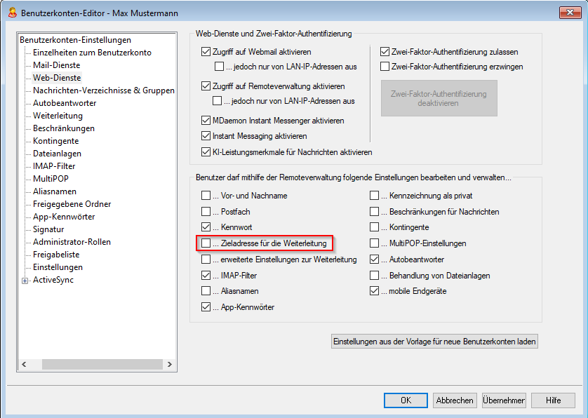 Unterbindung pro Benutzerkonto: Um einzelnen Personen das Weiterleiten von Nachrichten zu verbieten, öffnen Sie den Benutzerkonten-Manager und wählen den entsprechenden Benutzer aus. Hier klicken Sie im Reiter auf Web-Dienste und deaktivieren die Option "Zieladresse für Weiterleitung".