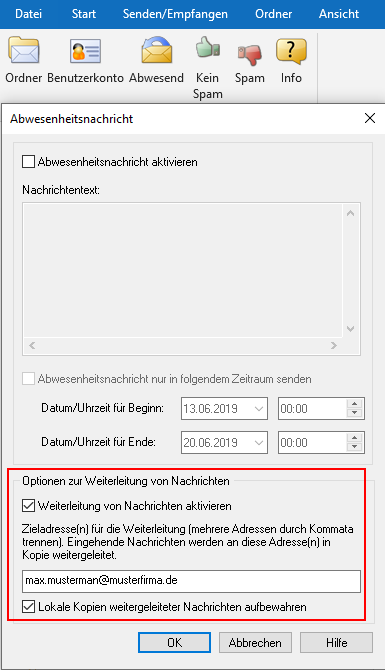 Normalerweise können Nutzer des MDaemon Email Server innerhalb des Webmailers unter Einstellungen → Benutzeranpassung → Weiterleitung eine Weiterleitung an eine externe E-Mail-Adresse einrichten. Dies ist auch in Outlook bei Verwendung des MDaemon Connector-Plugins über das Menüband MDaemon Connector → Abwesend möglich.