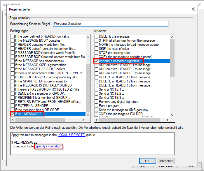 3. Klicken Sie den Button "Regel erstellen" und wählen Sie aus der Liste "IF ALL MESSAGES" und wählen rechts "Append a corporate signature".