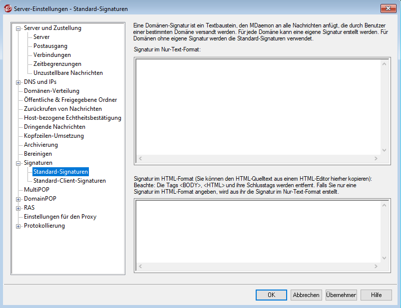 Seit MDaemon Version 10.x lassen sich auch unter dem Menü Einstellungen → Server-Einstellungen → Signaturen → Standard-Signaturen entsprechende globale Signaturen konfigurieren.