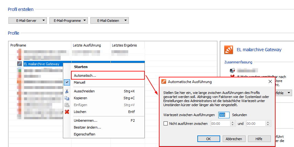 Um das Intervall zu konfigurieren, führen Sie einen Rechtsklick auf das Profil auf und wählen im Kontextmenü die Funktion „Automatisch“. Im sich öffnenden Popup kann dann das Intervall definiert werden.