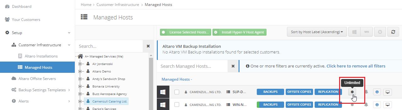 - Navigieren Sie dann zu Setup → Customer Infrastructure → Managed Hosts, klicken Sie auf das Lizenz-Icon, welches bei Mouse-over den Lizenztyp anzeigt (Freeware, Standard, Unlimited, Unlimited Plus - abhängig davon, welche Lizenzart verwendet wurde).