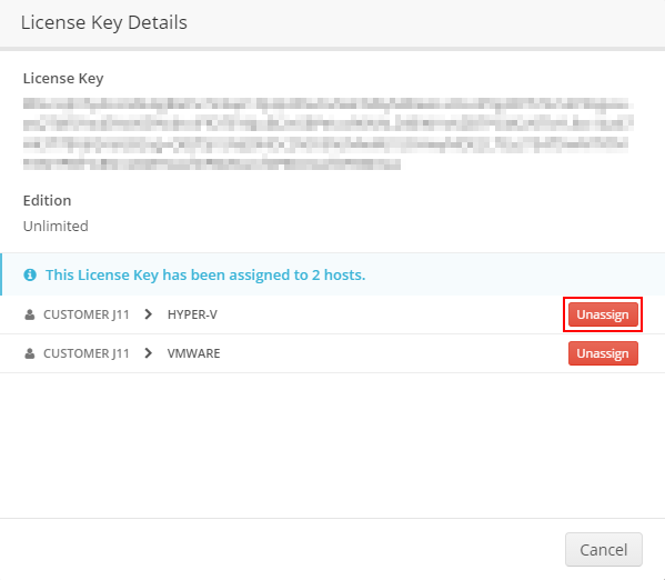- Im sich nun öffnenden Fenster sehen Sie eine Liste aller lizenzierten Hosts. Wenn Sie nun bei der gewünschten Lizenz auf den Button "Unassign" klicken, tritt automatisch die Subscription-Lizenz in Kraft und der Host ist umgestellt. Die vorher verwendete Langzeitlizenz kann mit dem gleichen Lizenzschlüssel verwendet werden, um einen anderen Host zu lizenzieren.