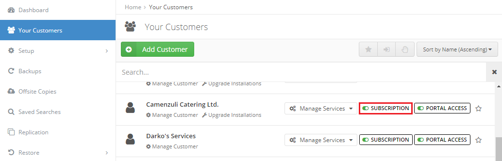- Um das Lizenzmodell zu ändern, navigieren Sie in der Altaro Cloud Management Console (CMC) zu "Your Customers". Dort aktivieren Sie für den gewünschten Kunden die Option "Subscription".