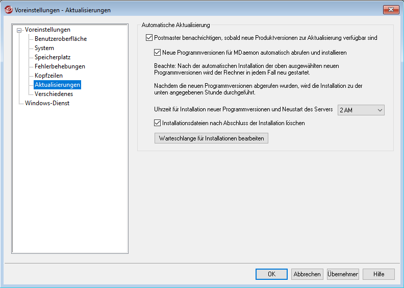 Dort können Sie durch die Optionen "Postmaster benachrichtigen, sobald neue Produktversion zu Aktualisierung verfügbar sind" und "Neue Programmversionen für MDaemon automatisch abrufen und installieren" die automatische Softwareaktualisierung einschalten.