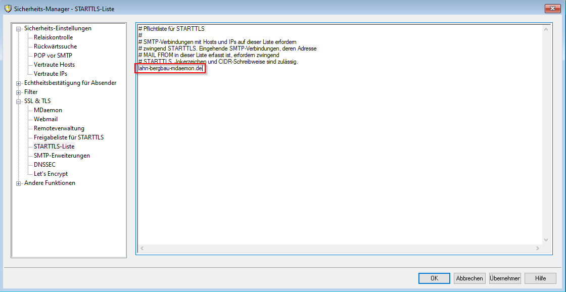 Die STARTTLS-Liste finden Sie in der MDaemon-GUI unter Sicherheit → Sicherheitsmanager → SSL & TLS → STARTTLS-Liste. In der dortigen Liste können Sie Gegenstellen mithilfe des STMP-Hostnamens, der öffentlichen IP-Adresse oder der E-Mail-Adresse hinterlegen. Die in dieser Liste aufgelisteten Gegenstellen müssen dann die eingehende SMTP-Verbindung zu Ihrem MDaemon-Server zwingend über STARTTLS aufbauen, andernfalls wird die Verbindung durch Ihren MDaemon abgebrochen. Ohne STARTTLS können die dort aufgelisteten Gegenstellen also keine Nachrichten mit Ihrem MDaemon-Server austauschen.