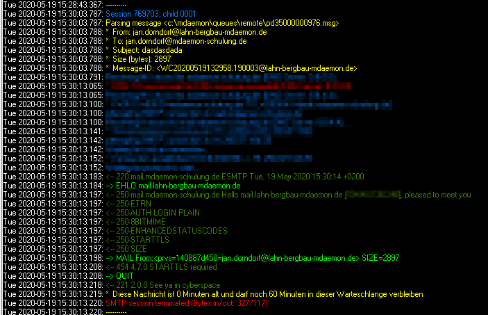 Auf einem empfangenden MDaemon-Server wurde in der STARTTLS-Liste "*lahn-bergbau-mdaemon.de" hinterlegt. Der versendende E-Mail-Server (ebenfalls ein MDaemon-Server) verschickt mit der Domäne "lahn-bergbau-mdaemon.de".