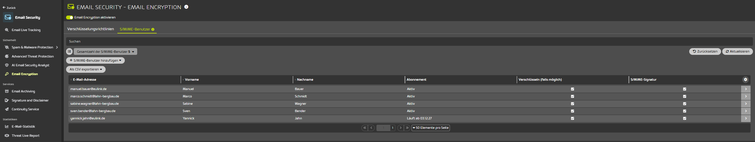 Für S/MIME-Zertifikate benötigen Sie die „E-Mail Encryption“, diese ist in den 365 TPE (ab Total Protection Business) Bundles bereits enthalten. Für S/MIME-Zertifikate fallen jährlich je Postfach 24 € an.