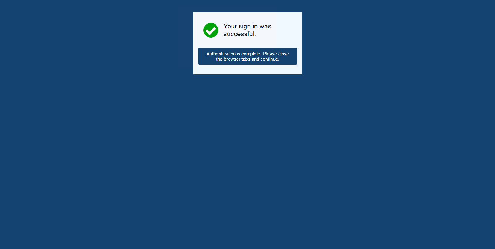Sobald Sie die Anmeldedaten eingegeben und sich erfolgreich authentifiziert haben, erhalten Sie folgende Meldung: