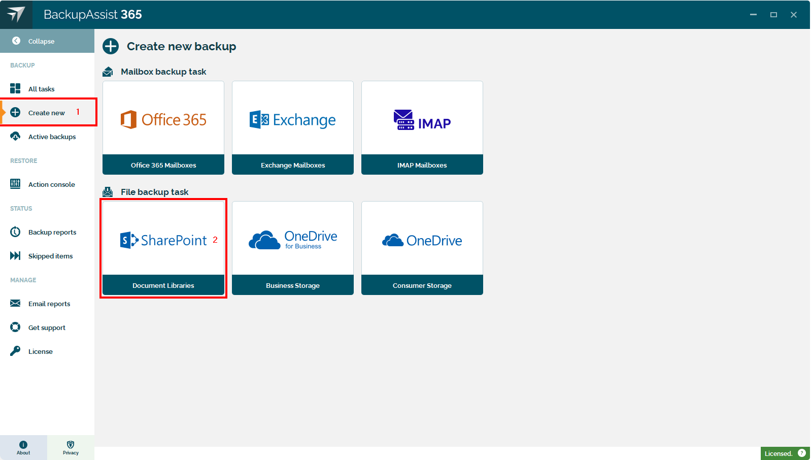 - Um einen neuen Backup-Task in BackupAssist 365 zu erstellen, navigieren Sie in der GUI zu dem Reiter "Create New" und wählen dann "SharePoint Document Libraries" aus.